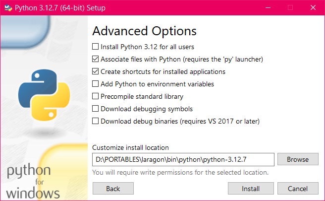- Los apuntes de esta sección hacen referencia a descargar la versión en formato exe de Python desde su web, para instalarlo como binario en Laragon, para esto debemos: